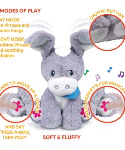 Play Peek-A-Boo – Turn On This Baby Toy And Start Having Fun! When You Press One Of The Buttons On Its Feet, The Its Donkey Ears Move Up And Down As The Toy Says ‘Peek-A-Boo, I See You!’ | Learn New Phrases – Encourage Your Little One To Babble Away With This Stuffed Donkey. It Is Programmed With Day And Night Modes Which Allow The Toy To Recite Specific Phrases For Your Child To Listen To. | Sing Happy Songs – Press The Toy’S Right Foot To Activate Its Musical Function. This Donkey Plush Can Play 2 Songs And 3 Nursery Rhymes: Twinkle Twinkle Little Star, Oh! Susanna, Mary Had A Little Lamb. | Soft & Huggable – Our Baby Stuffed Animal Is Made With Soft, Fluffy Material And Plush Stuffing That Make It Extra Cuddly! With Its Programmed Lullabies, It’S The Perfect Bedtime Companion. | Made For Your Kids – We’Re Dedicated To Providing Contemporary Parents With Modern Solutions. Our Products Are Specially Designed To Be Fun And Colorful While Helping With Early Childhood Learning.