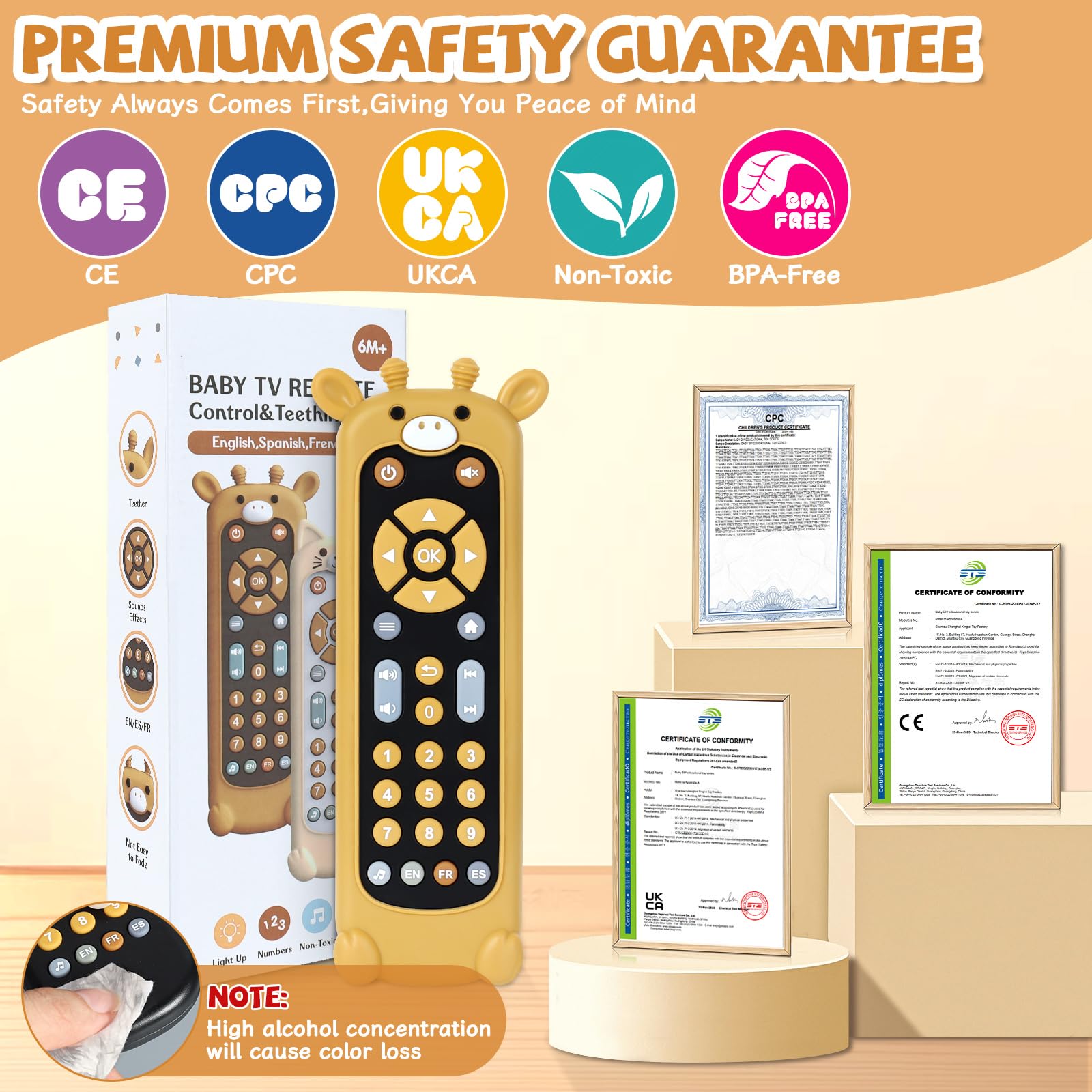 Orzbow Baby Remote Control Toy For 6 Month+ With Silicone Teether Cover, Tv Remote Toy With Realistic Light And Sound – English, French And Spanish For Infant Play Remote Musical Toys, Bpa Free, Black